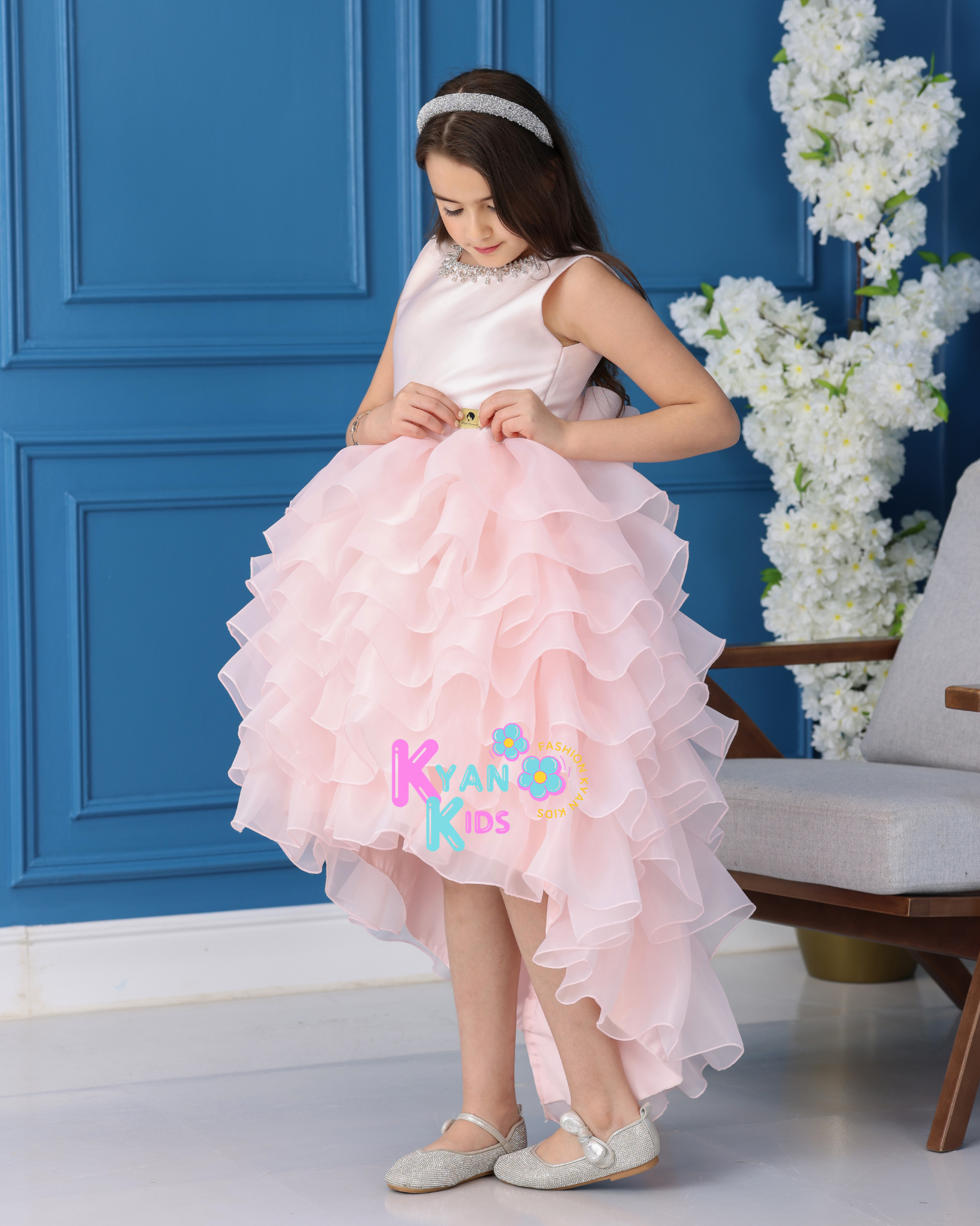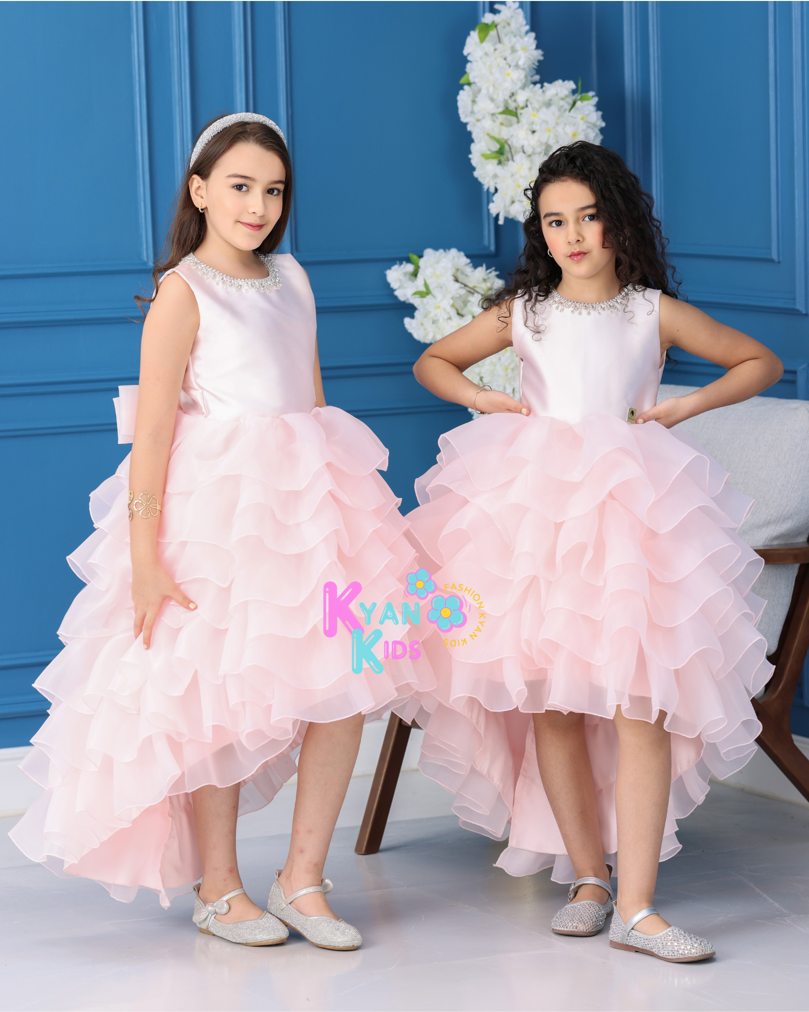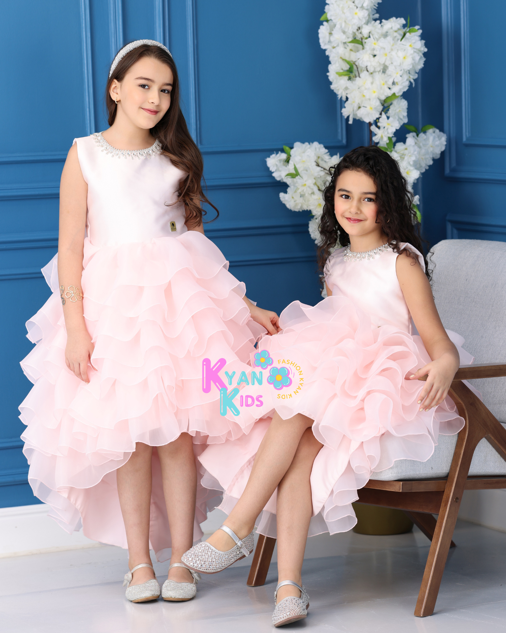 يتميز الفستان بقصة منفوشة رائعة مع طبقات تول ناعمة عند الخصر، وتفاصيل الكريستال على الرقبة لإطلالة براقة وجذابة. التصميم مرتفع من الأمام ونازل من الخلف ليمنح حركة وأناقة مثالية أثناء الحفلات والمناسبات الرسمية، مثالي لجميع فساتين سهرة للأطفال والمناسبات الخاصة.